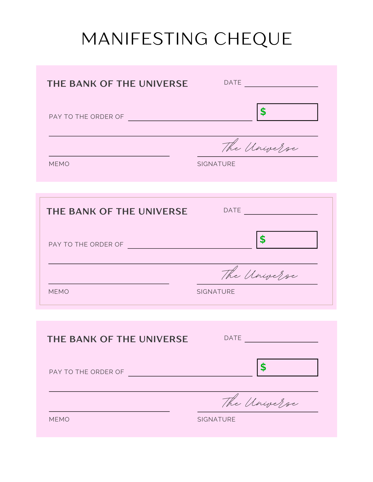 This book covers everything from understanding exactly what it is that you want to manifest, finding your why for manifesting these things, the 3-6-9 method, the check method , a monthly planner for month of the year, and the list goes on.